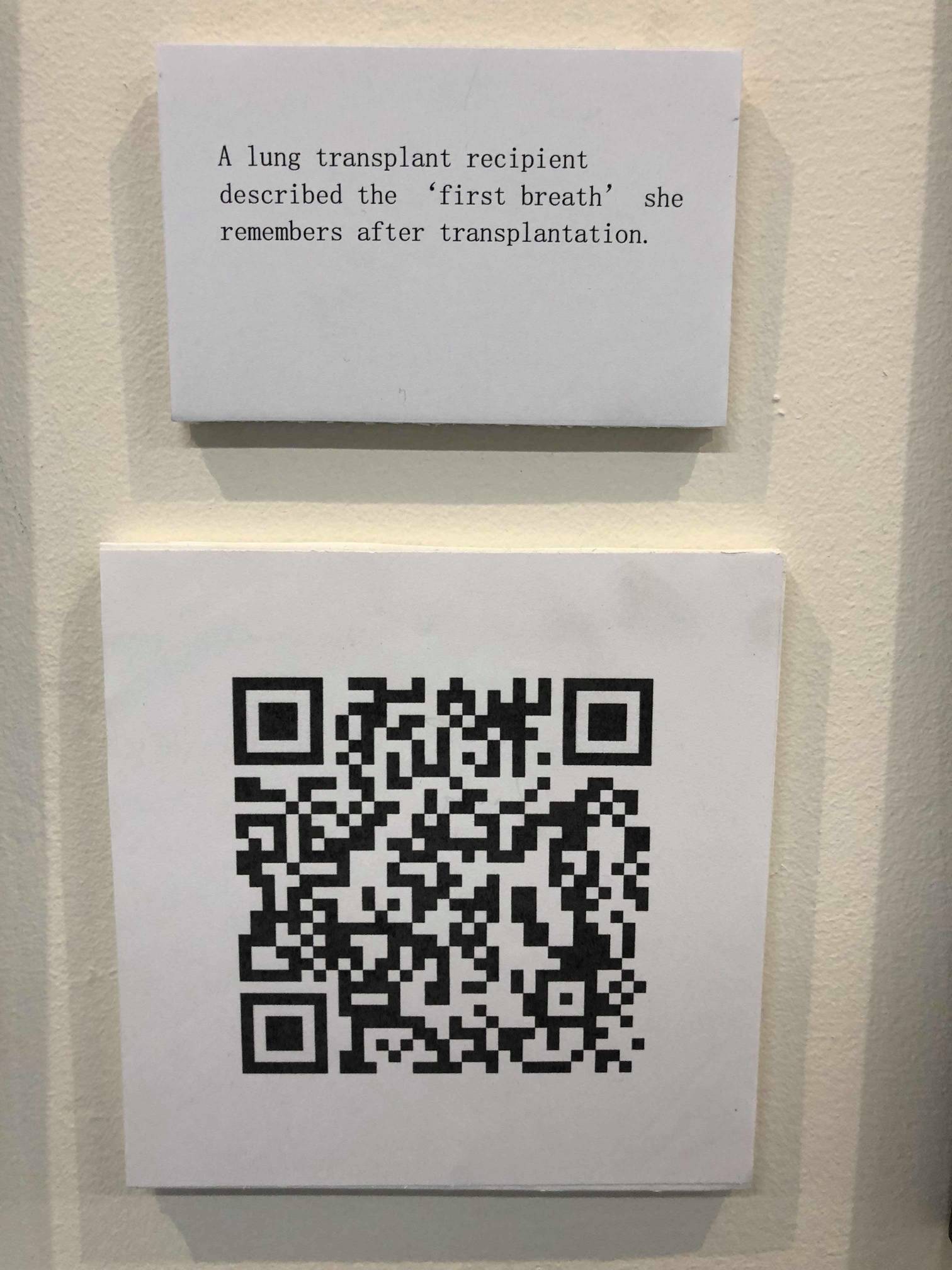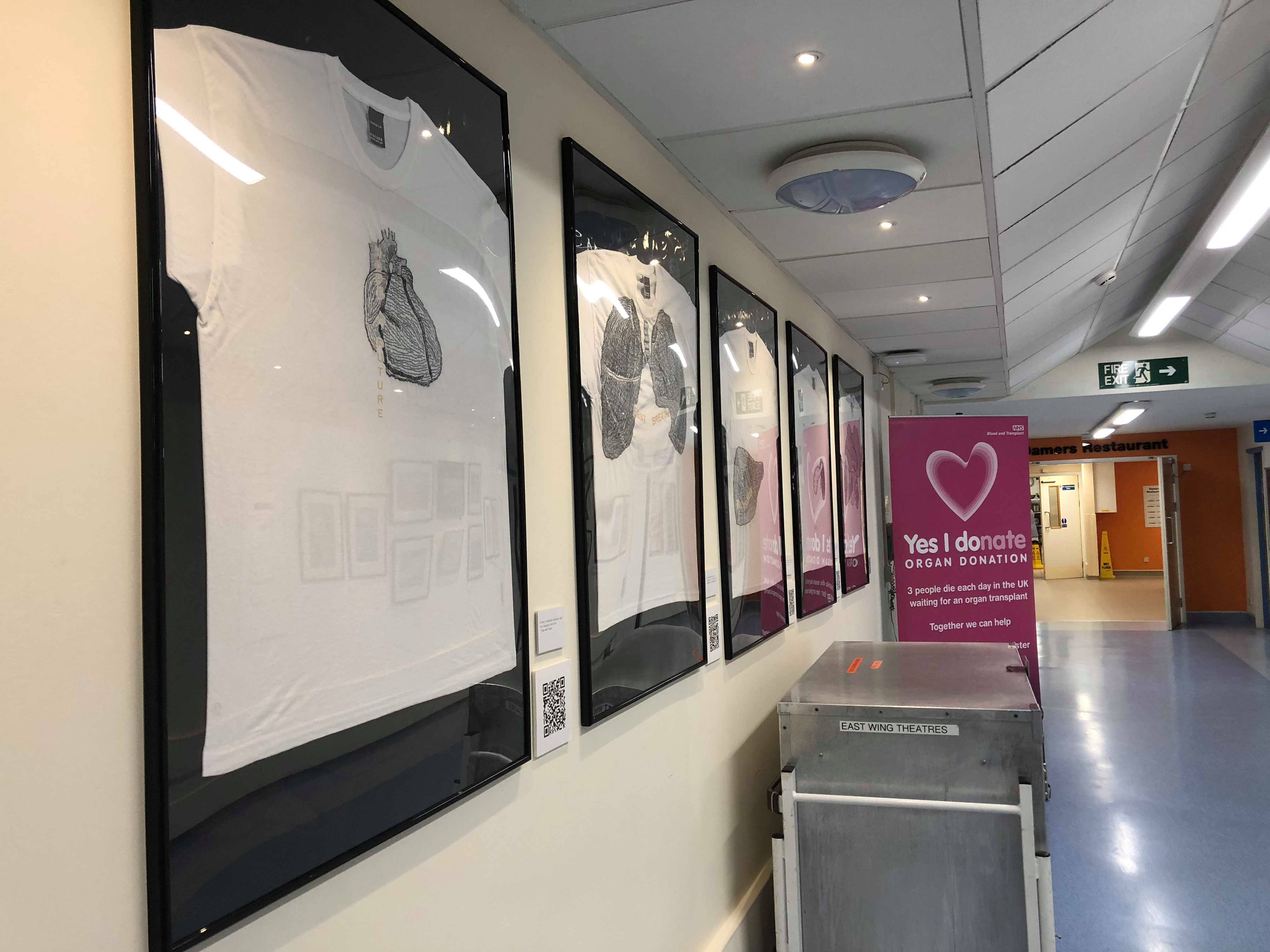 QR codes alongside each embroidered shirt link to interviews with the individuals that Emma spoke to about organ donation.