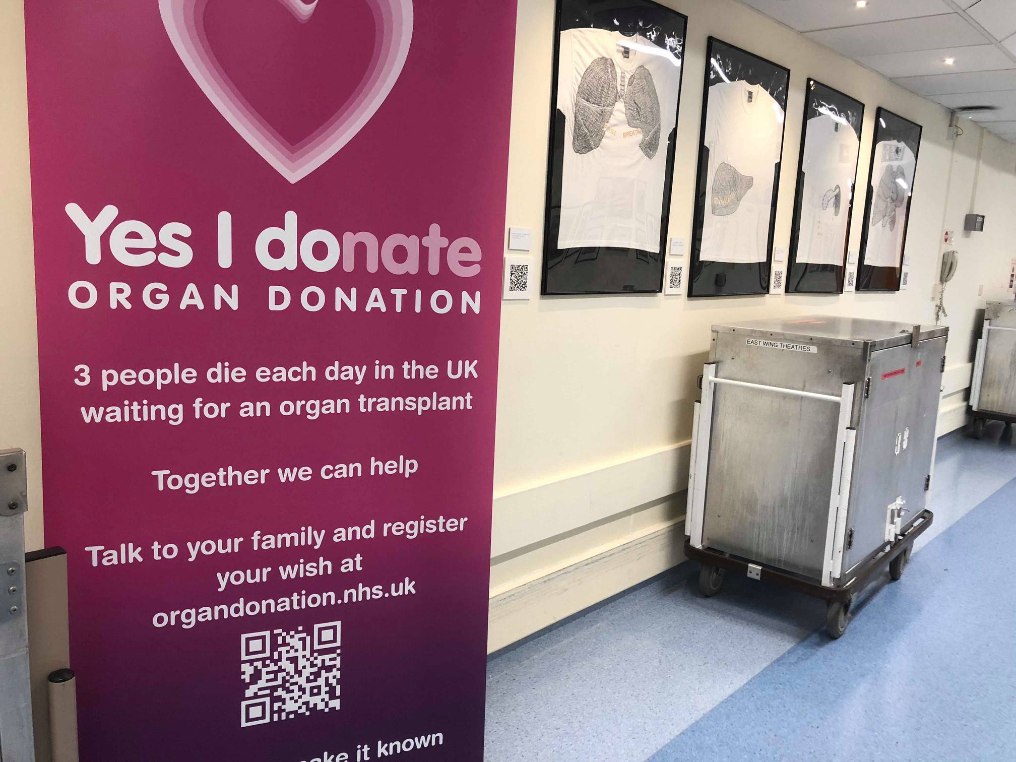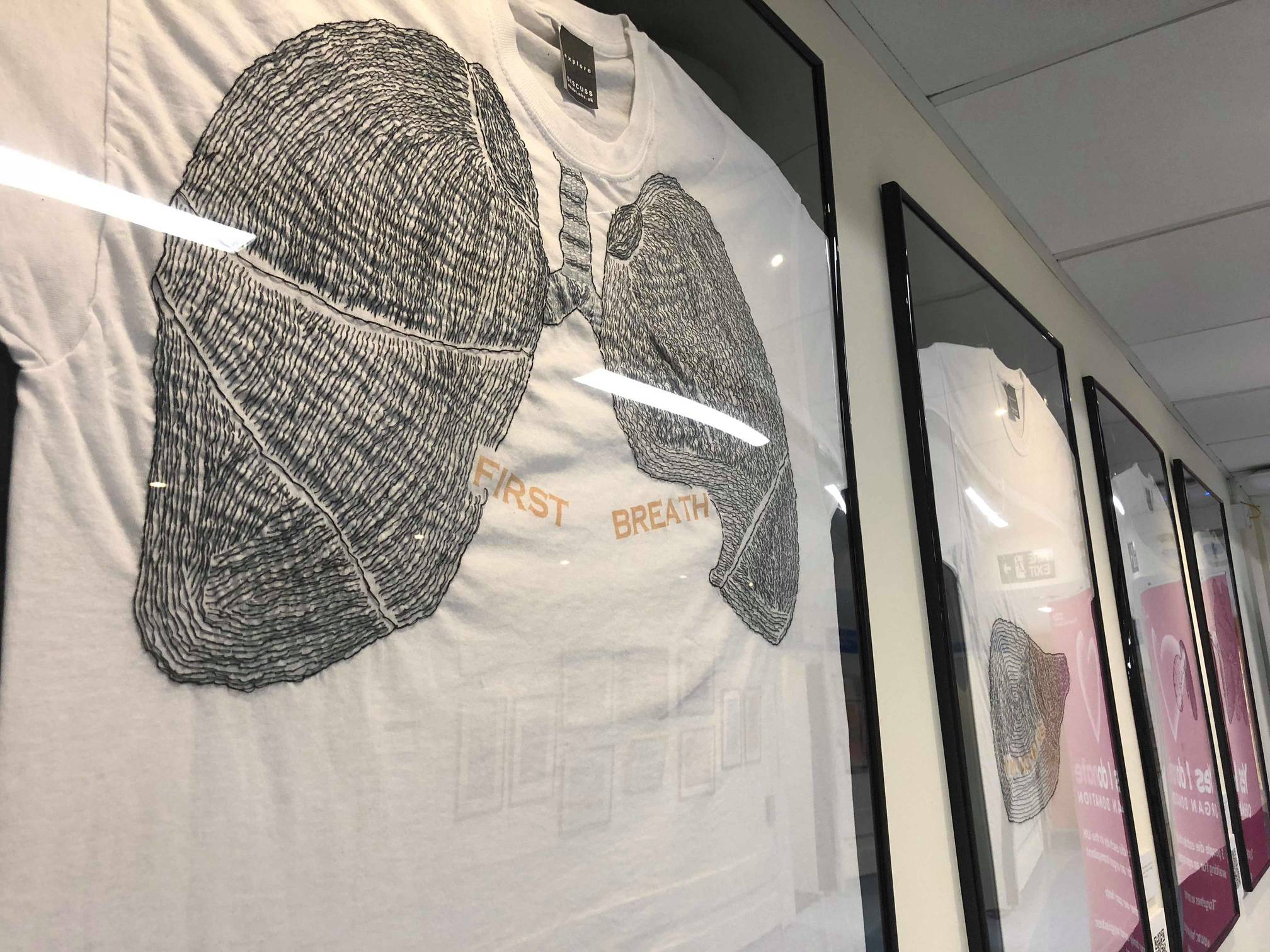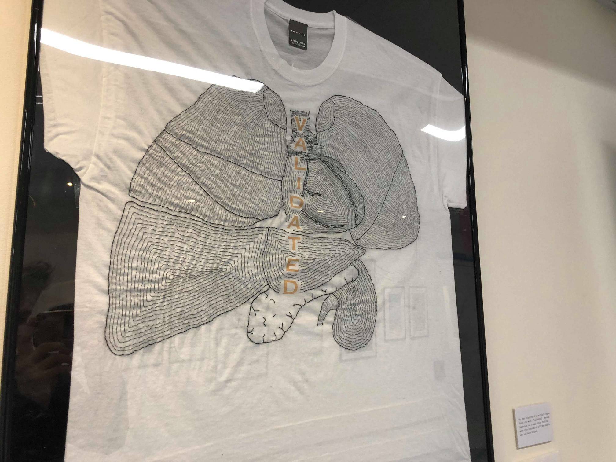 The artwork features a series of compelling embroidered T-shirts showing organs that the public could donate to those in crucial need of transplants.