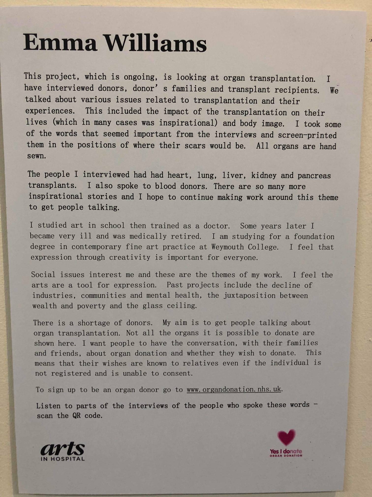 Emma Williams interviewed local organ donors, donor’s families and transplant recipients about their personal journeys. Emma took what she thought were the most salient words from her interviews and screen printed them in positions of where the organ recipients’ scars would be, and then hand sewed the organs around them.