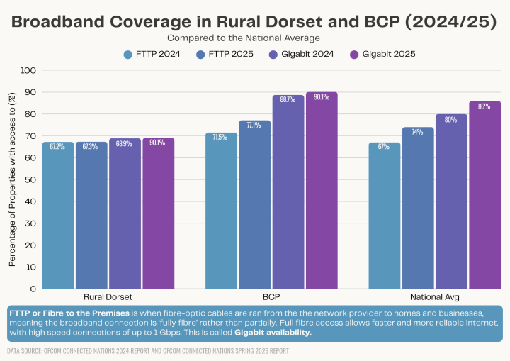 Whilst the BCP outperforms the national average of 74% FFTP and 86% gigabit access, rural Dorset trails it in both categories, underlining the uneven rollout between rural and urban communities.