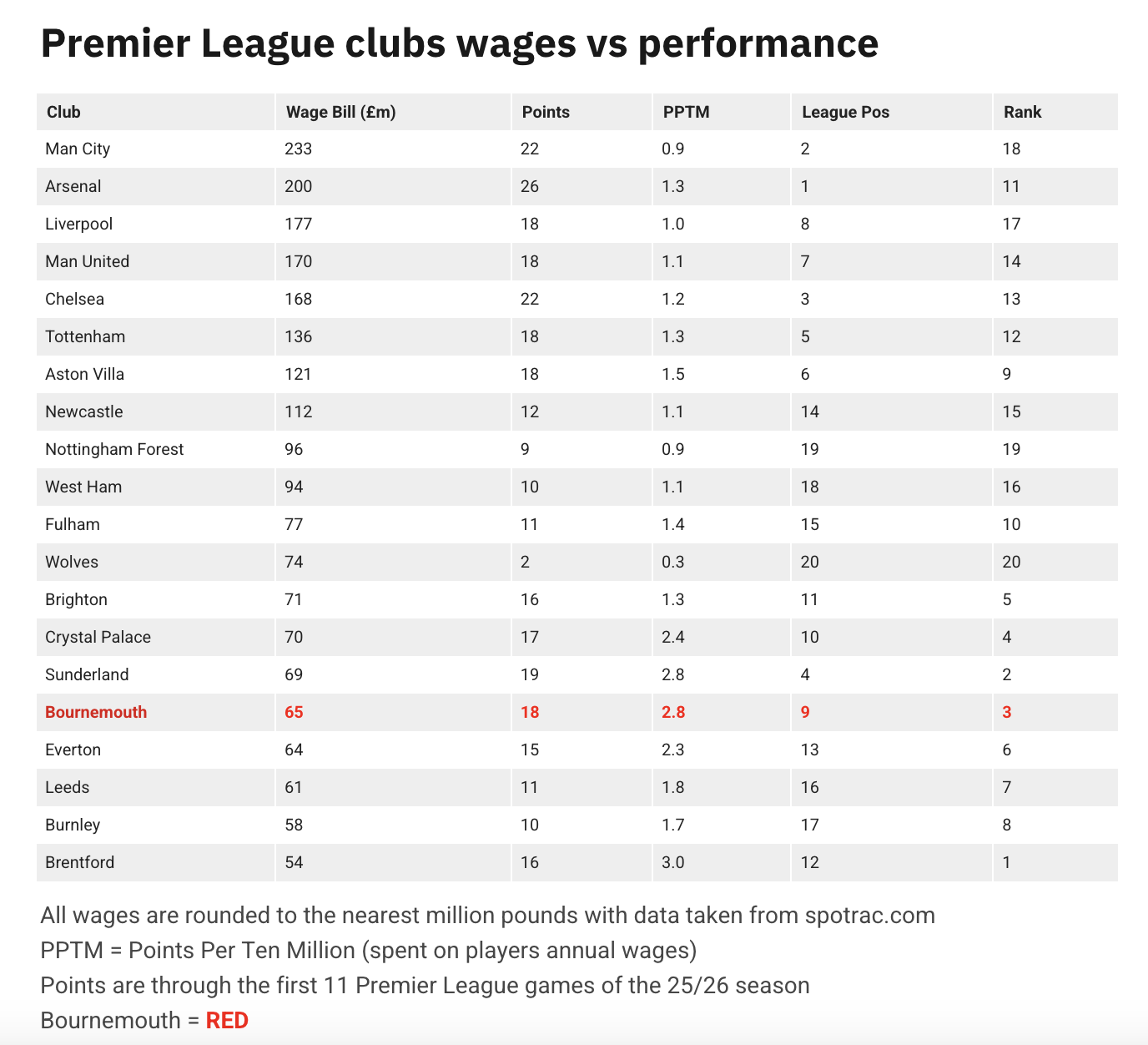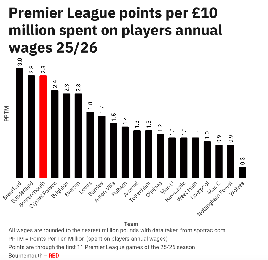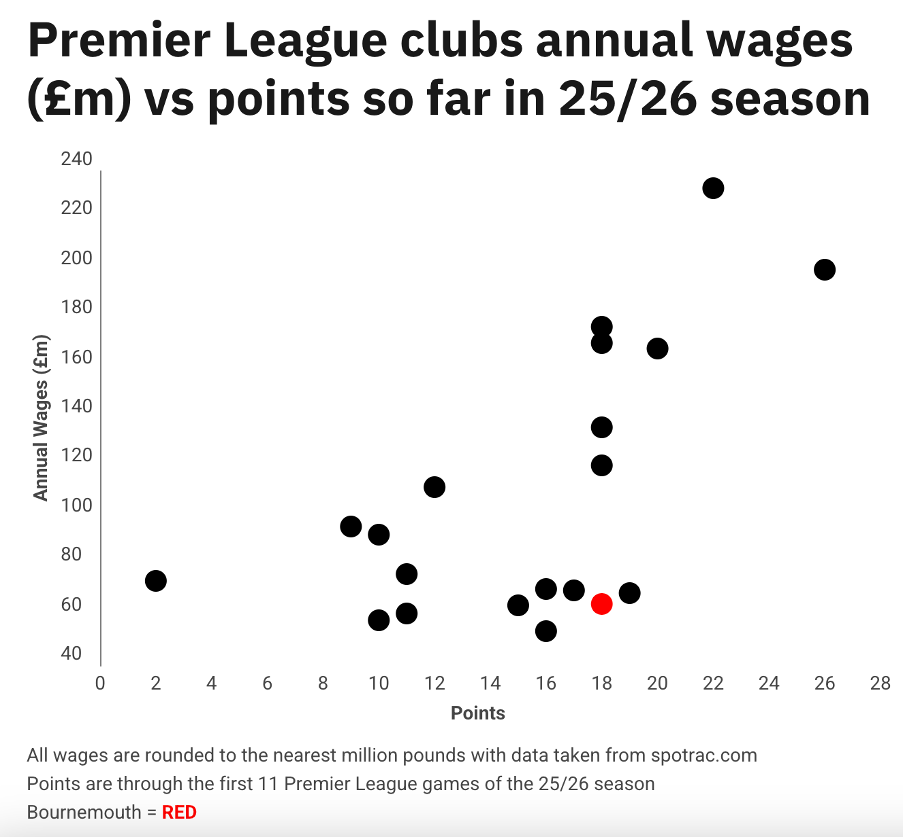 AFC Bournemouth are proving that money isn’t everything in the 2025/26 Premier League season, by comparing club wage bills with on-pitch performance.